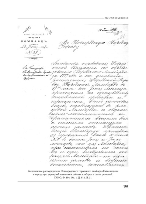 2025/7/NOVGORODICA Уведомление распорядителя Новгородского городского ломбарда Небылицына в городскую управу об изменении работы ломбарда в связи ревизией. ГАНО. Ф. 104. Оп. 1. Д. 911. Л. 31 195