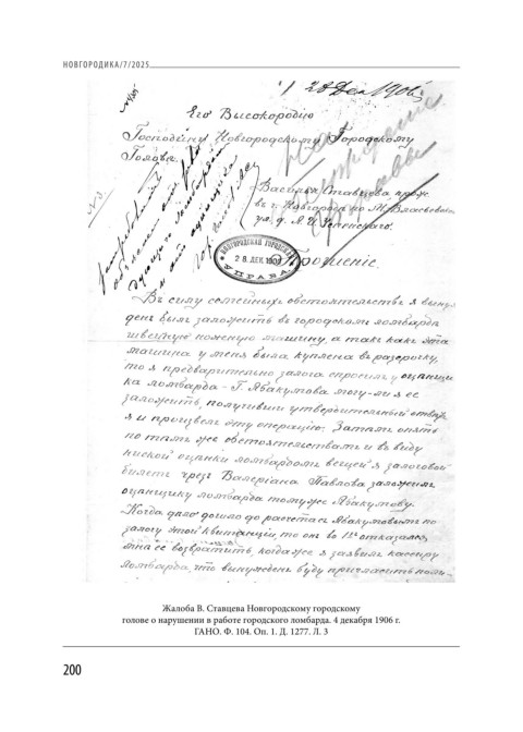 НОВГОРОДИКА/7/2025 Жалоба В. Ставцева Новгородскому городскому голове о нарушении в работе городского ломбарда. 4 декабря 1906 г. ГАНО. Ф. 104. Оп. 1. Д. 1277. Л. 3 200