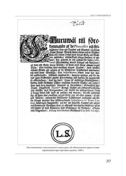 2025/7/NOVGORODICA Постановление стокгольмского магистрата об обязательном присутствии переводчика при торговых сделках. 1690 г. 217