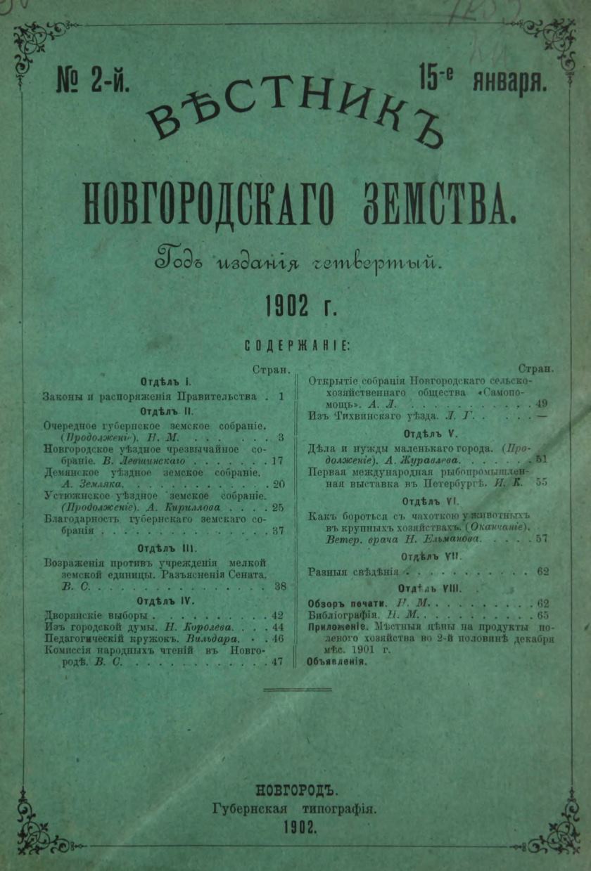 Вестник Новгородского земства / [ред. Н. Н. Сомов]. - год издания четвертый. 1902, № 2 (15-е января) - page 1