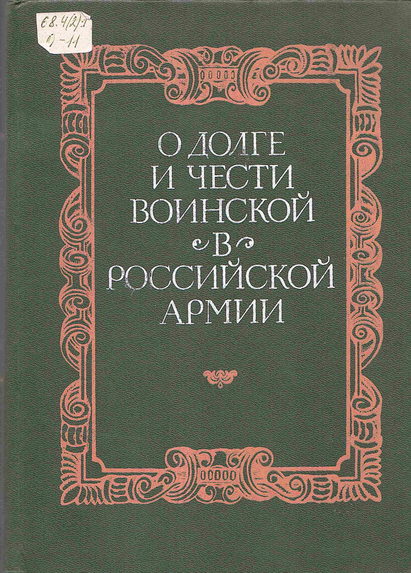 - О долге и чести воинской в российской армии : сборник материалов, документов и статей / сост.: Ю. А. Галушко, А. А. Колесников ; ред. В. Н. Лобанов. - Москва : Воениздат, 1991. - 364 с. : ил. Шифр: 68.4(2)1 О 11.