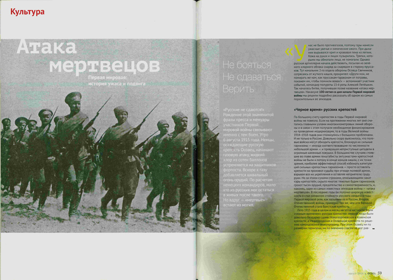 - Залесский, К. Атака мертвецов : первая мировая: история ужаса и подвига / Константин Залесский // Фома. - 2014. - № 8. - С. 58-61 : ил., фот.