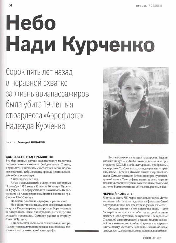 - Бочаров Г. Небо Нади Курченко // Родина. – 2015. - № 10. – С. 51-53.