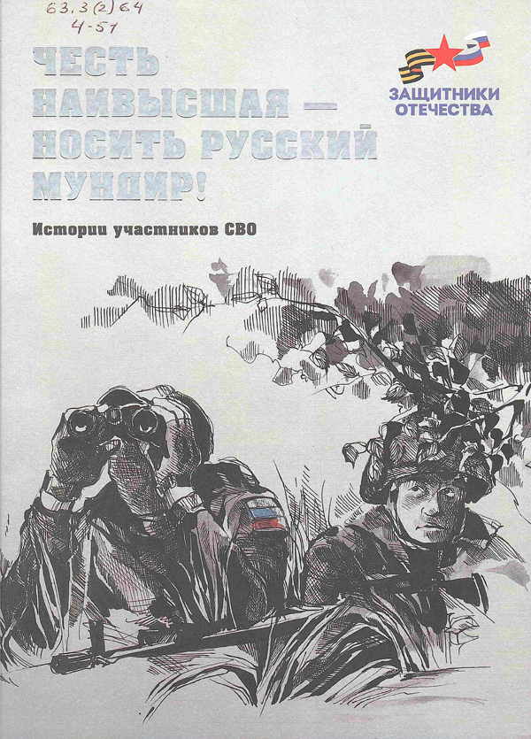 - Честь наивысшая - носить русский мундир! : истории участников СВО / сост: Захар Прилепин [и др.] ; Благотворительный фонд Захара Прилепина, Центр Традиция. - Санкт-Петербург : Лира, 2024. - 254, [2] с. : ил. - (Защитники Отечества) (КПД). Шифр: 63.3(2)64 Ч 51.