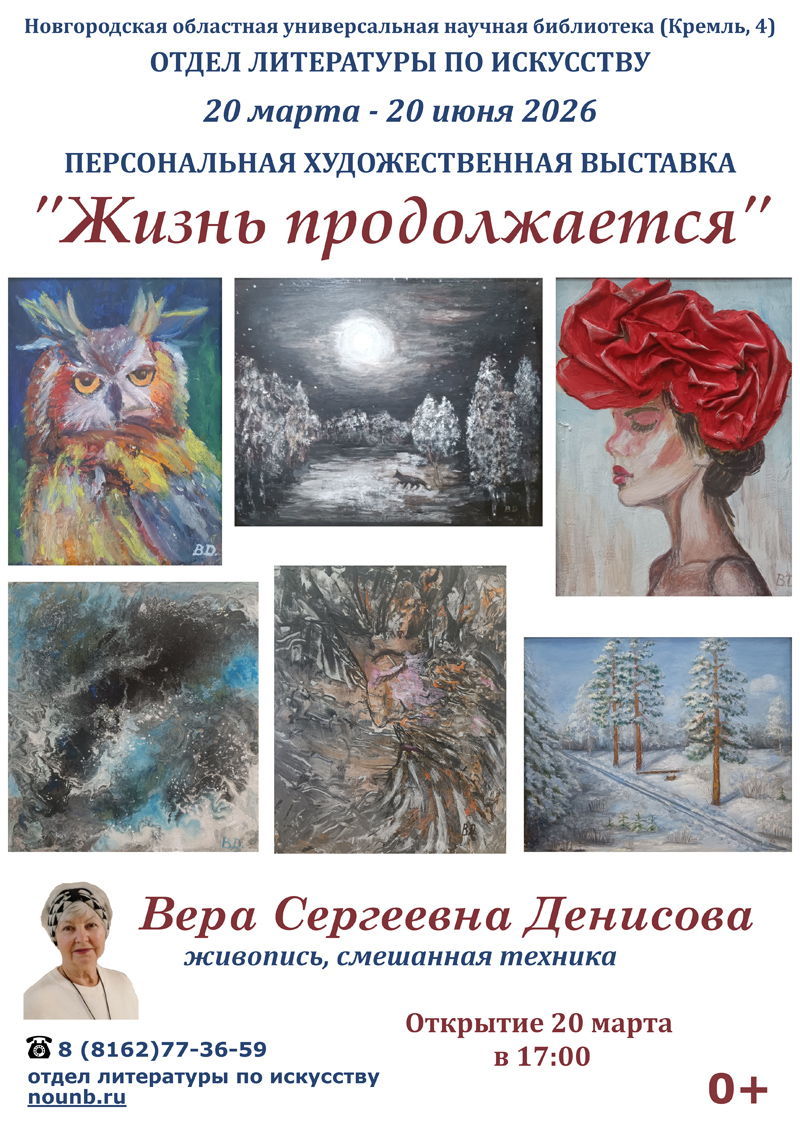 20 марта в 17.00 в отделе литературы по искусству Новгородской областной универсальной научной библиотеки (Кремль, 4) состоится открытие выставки новгородской художницы Веры Денисовой "Жизнь продолжается". Представлены живописные произведения и работы в смешанной технике. Вы увидите лирические пейзажи, анималистику, изображения цветов и смелые экспериментальные полотна.