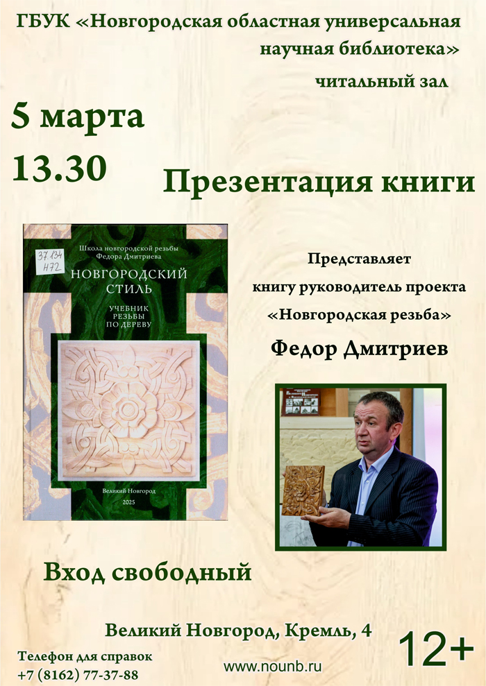 5 марта в 13:30 в читальном зале Новгородской областной универсальной научной библиотеки (Кремль, 4) состоится презентация книги «Новгородский стиль»: учебник резьбы по дереву. Представит книгу руководитель проекта «Новгородская резьба», резчик по дереву Федор Рольфович Дмитриев.